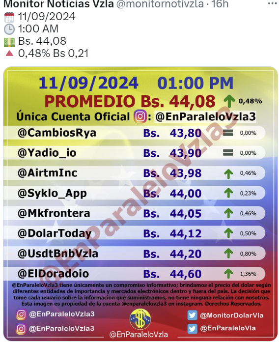 Por otro lado, el dólar paralelo en diversas plataformas en la jornada de hoy cerró en un promedio de Bs.44,08 la unidad, según Monitor-Noticias Venezuela.