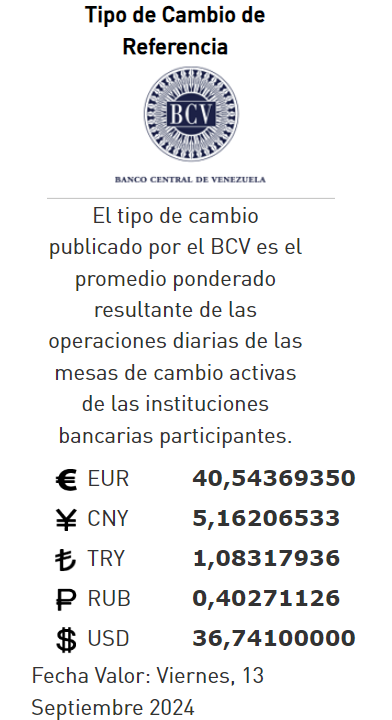 13-09-24.-El precio del dólar en el Banco Central de Venezuela (BCV) se cotizó este jueves 12 de septiembre 2024 en Bs. 36,74 por unidad según la última actualización en su página web oficial y redes sociales.