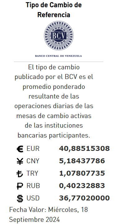 18-09-24.-El precio del dólar en el Banco Central de Venezuela (BCV) se cotizó este martes 17 de septiembre 2024 en Bs. 36,77 por unidad según la última actualización en su página web oficial y redes sociales.   https://www.bcv.org.ve/