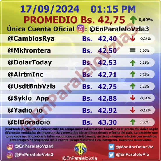 Por otro lado, el dólar paralelo en diversas plataformas en la jornada de hoy cerró en un promedio de Bs.42,75 la unidad, según Monitor-Noticias Venezuela.