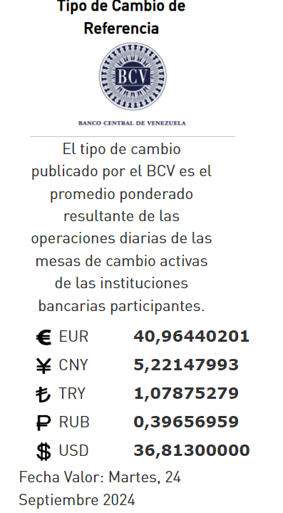 24-09-24.-El precio del dólar en el Banco Central de Venezuela (BCV) se cotizó este lunes 23 de septiembre 2024 en Bs. 36,81 por unidad según la última actualización en su página web oficial y redes sociales.