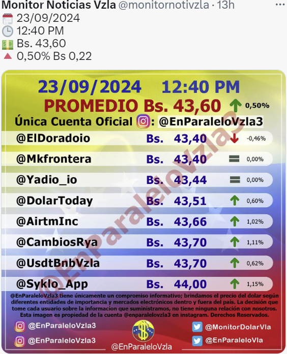 Por otro lado, el dólar paralelo en diversas plataformas en la jornada de hoy cerró en un promedio de Bs 43,60 la unidad, según Monitor-Noticias Venezuela.