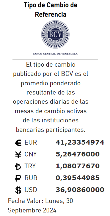 28-09-24.-El precio del dólar en el Banco Central de Venezuela (BCV) se cotizó este viernes 28 de septiembre 2024 en Bs. 36,90 por unidad según la última actualización en su página web oficial y redes sociales.