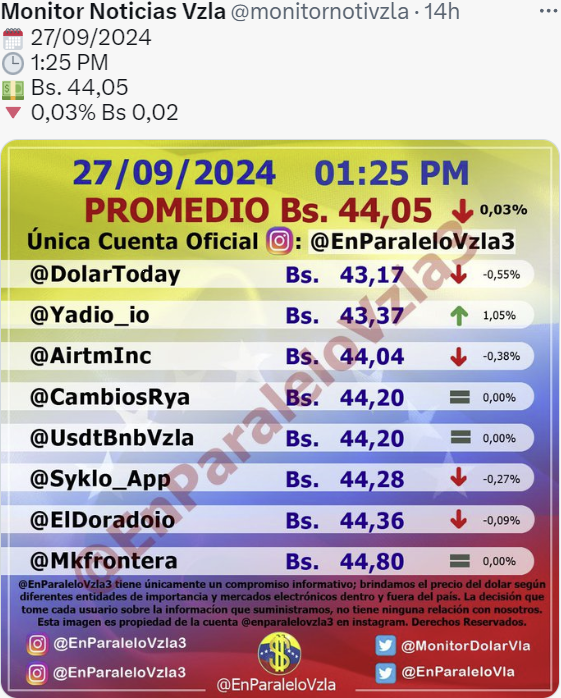 Por otro lado, el dólar paralelo en diversas plataformas en la jornada de hoy cerró en un promedio de Bs.44,05 la unidad, según Monitor-Noticias Venezuela.