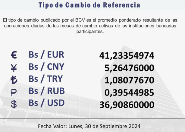 01-10-24.-El precio del dólar en el Banco Central de Venezuela (BCV) se cotizó este lunes 30 de septiembre 2024 en Bs. 36,90 por unidad según la última actualización en su página web oficial y redes sociales.