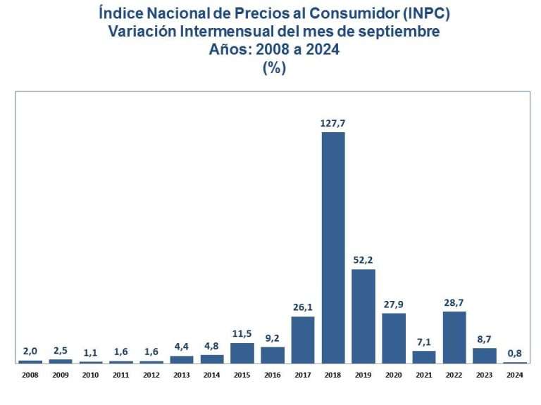 “La inflación de septiembre de 2024 es la más baja para un mes de septiembre desde que inició la construcción del índice a nivel nacional en el año 2008, a pesar de las múltiples limitaciones al financiamiento internacional y a recursos propios por las medidas unilaterales impuestas a la República”, precisó el ente en una nota de prensa.