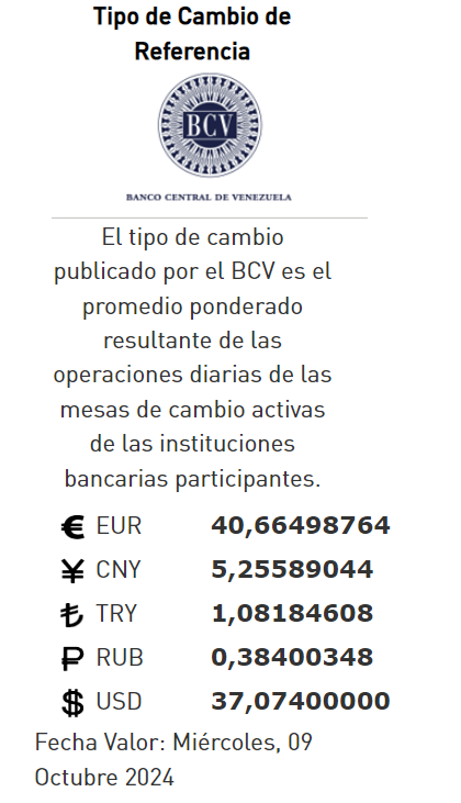 -10-24.-El precio del dólar en el Banco Central de Venezuela (BCV) se cotizó este martes 08 de octubre 2024 en Bs. 37,07 por unidad según la última actualización en su página web oficial y redes sociales.