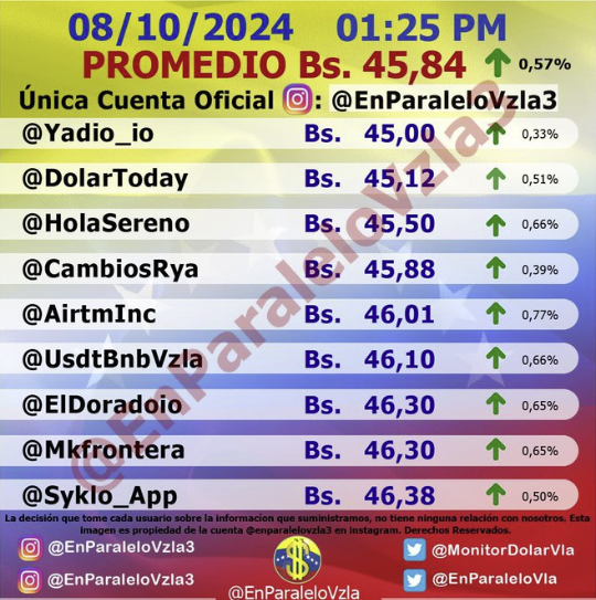 Por otro lado, el dólar paralelo en diversas plataformas en la jornada de hoy cerró en un promedio de Bs.45,84 la unidad, según Monitor-Noticias Venezuela.