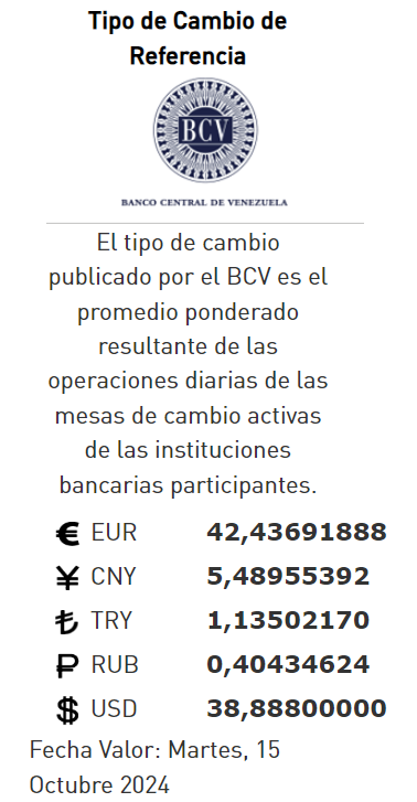 15-10-24.-El precio del dólar en el Banco Central de Venezuela (BCV) se cotizó este lunes 14 de octubre 2024 en Bs. 38,88 por unidad según la última actualización en su página web oficial y redes sociales.
