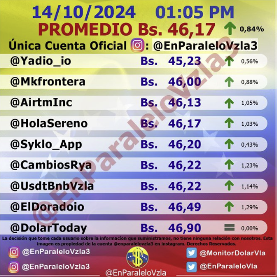 Por otro lado, el dólar paralelo en diversas plataformas en la jornada de hoy cerró en un promedio de Bs.46,17 la unidad, según Monitor-Noticias Venezuela.