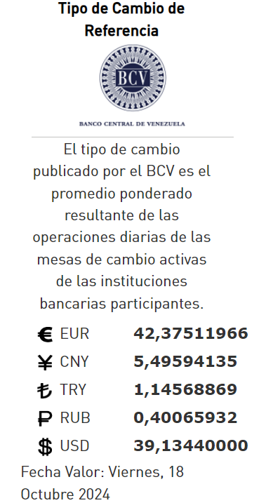18-10-24.-El precio del dólar en el Banco Central de Venezuela (BCV) se cotizó este jueves 17 de octubre 2024 en Bs. 39.13 por unidad según la última actualización en su página web oficial y redes sociales.