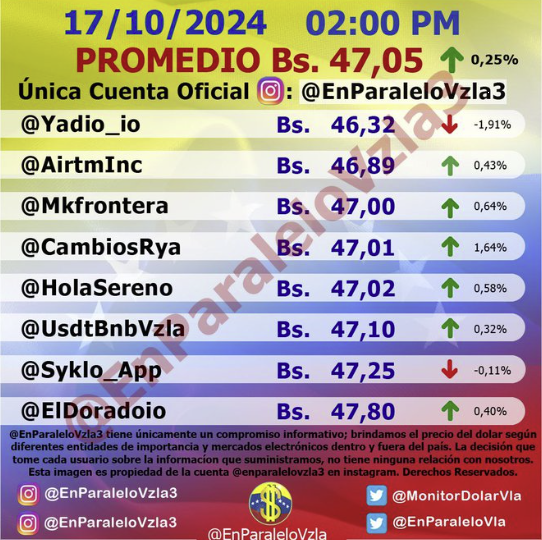 Por otro lado, el dólar paralelo en diversas plataformas en la jornada de hoy cerró en un promedio de Bs.47,05 la unidad, según Monitor-Noticias Venezuela.