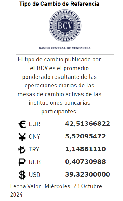 23-10-24.-El precio del dólar en el Banco Central de Venezuela (BCV) se cotizó este martes 22 de octubre 2024 en Bs. 39,32 por unidad según la última actualización en su página web oficial y redes sociales.