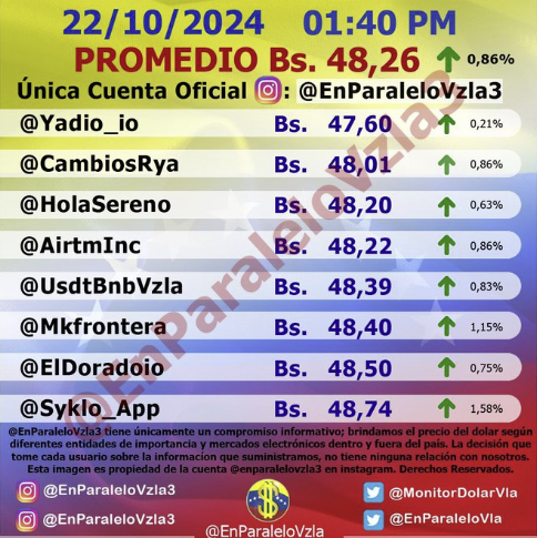 Por otro lado, el dólar paralelo en diversas plataformas en la jornada de hoy cerró en un promedio de Bs.48,26 la unidad, según Monitor-Noticias Venezuela.