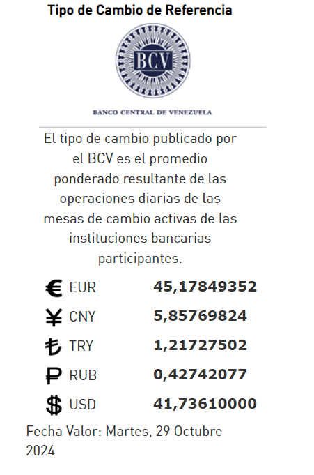29-10-24.-El precio del dólar en el Banco Central de Venezuela (BCV) se cotizó este lunes 28 de octubre 2024 en Bs.4 por unidad según la última actualización en su página web oficial y redes sociales.