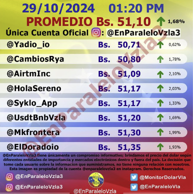 Por otro lado, el dólar paralelo en diversas plataformas en la jornada de hoy cerró en un promedio de Bs.51,10 la unidad, según Monitor-Noticias Venezuela.