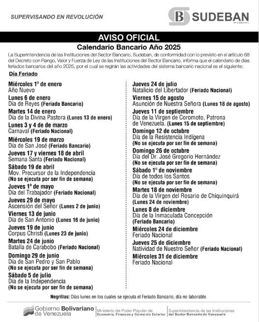 05-11-24.-La Superintendencia de las Instituciones del Sector Bancario (Sudeban), publicó el calendario bancario del año 2025.