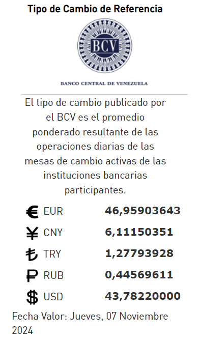 07-11-24.-El precio del dólar en el Banco Central de Venezuela (BCV) se cotizó este miércoles 06 de noviembre 2024 en Bs.43,78 por unidad según la última actualización en su página web oficial y redes sociales.