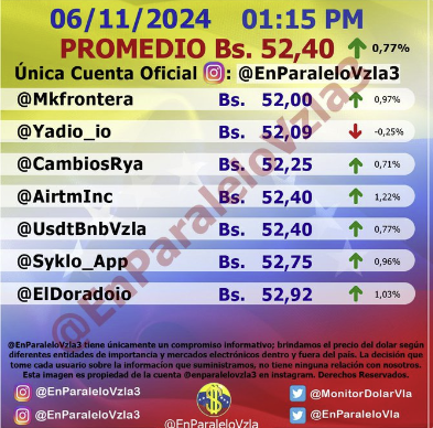 Por otro lado, el dólar paralelo en diversas plataformas en la jornada de hoy cerró en un promedio de Bs.52,40 la unidad, según Monitor-Noticias Venezuela.