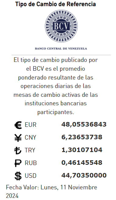 09-11-24.-El precio del dólar en el Banco Central de Venezuela (BCV) se cotizó este viernes 08 de noviembre 2024 en Bs.44,70 por unidad según la última actualización en su página web oficial y redes sociales.