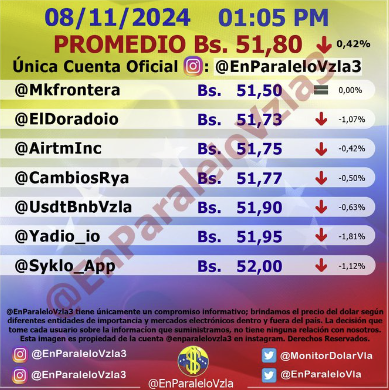 Por otro lado, el dólar paralelo en diversas plataformas en la jornada de hoy cerró en un promedio de Bs.5i,80 la unidad, según Monitor-Noticias Venezuela.