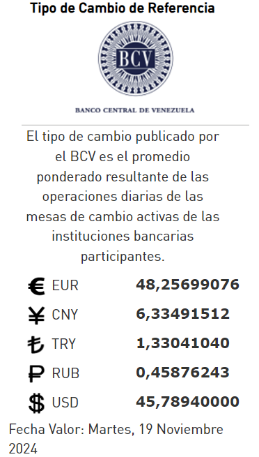 19-11-24.-El precio del dólar en el Banco Central de Venezuela (BCV) se cotizó este lunes 18 de noviembre 2024 en Bs.45,78 por unidad según la última actualización en su página web oficial y redes sociales.