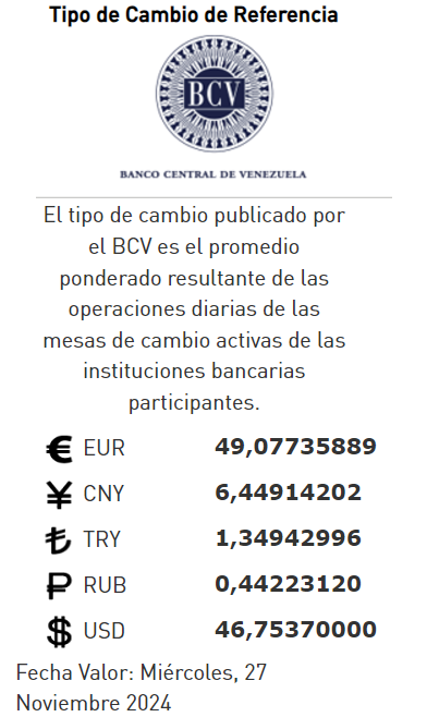 27-11-24.-El precio del dólar en el Banco Central de Venezuela (BCV) se cotizó este martes 26 de noviembre 2024 en Bs.46,75 por unidad según la última actualización en su página web oficial y redes sociales.