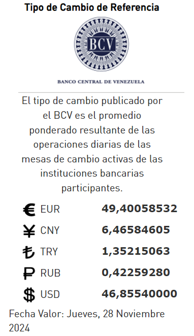 28-11-24.-El precio del dólar en el Banco Central de Venezuela (BCV) se cotizó este miércoles 27 de noviembre 2024 en Bs.46,85 por unidad según la última actualización en su página web oficial y redes sociales.