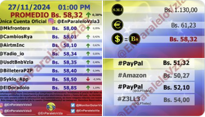Por otro lado, el dólar paralelo en diversas plataformas en la jornada de hoy cerró en un promedio de Bs.58,32 la unidad, según Monitor-Noticias Venezuela.