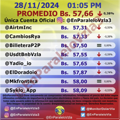 Por otro lado, el dólar paralelo en diversas plataformas en la jornada de hoy cerró en un promedio de Bs.57,66 la unidad, según Monitor-Noticias Venezuela.