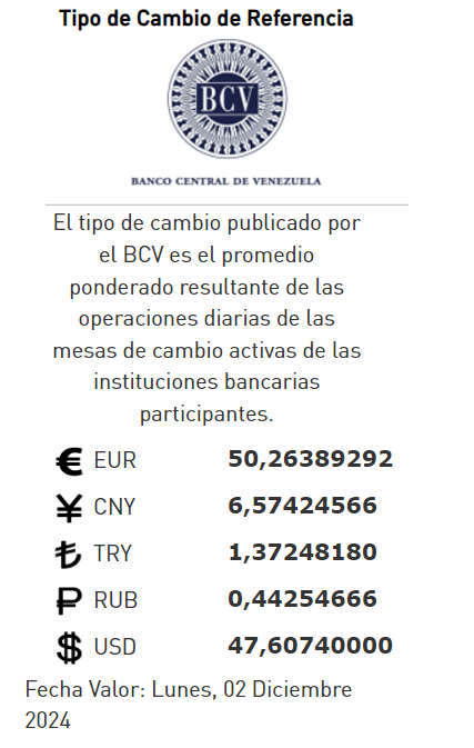 30-11-24.-El precio del dólar en el Banco Central de Venezuela (BCV) se cotizó este viernes 29 de noviembre 2024 en Bs.47,60 por unidad según la última actualización en su página web oficial y redes sociales.