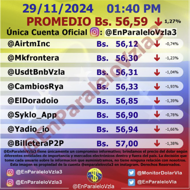 Por otro lado, el dólar paralelo en diversas plataformas en la jornada de hoy cerró en un promedio de Bs.56,59 la unidad, según Monitor-Noticias Venezuela.
