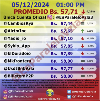 Por otro lado, el dólar paralelo en diversas plataformas en la jornada de hoy cerró en un promedio de Bs.57,71 la unidad, según Monitor-Noticias Venezuela.