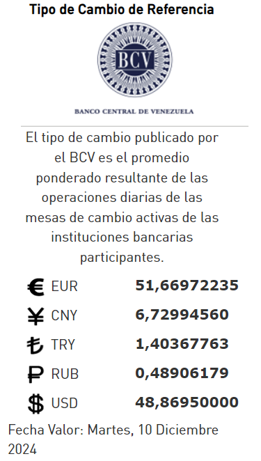 10-12-24.-El precio del dólar en el Banco Central de Venezuela (BCV) se cotizó este lunes 09 de diciembre 2024 en Bs.48,86 por unidad según la última actualización en su página web oficial y redes sociales.