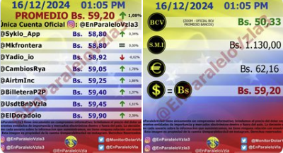 Por otro lado, el dólar paralelo en diversas plataformas en la jornada de hoy cerró en un promedio de Bs.59,20 la unidad, según Monitor-Noticias Venezuela.