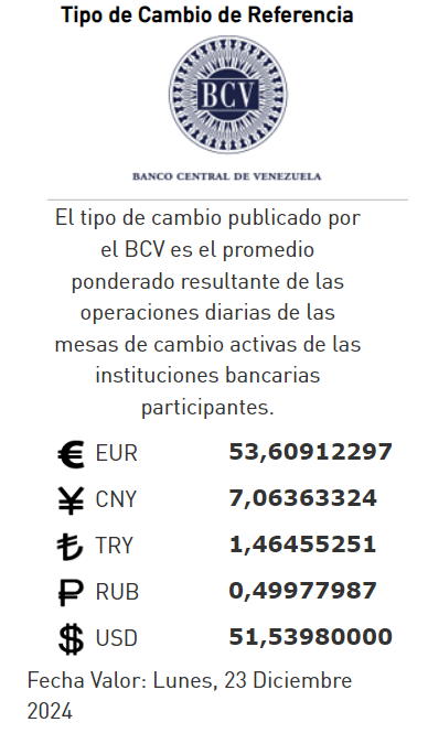 21-12-24.-El precio del dólar en el Banco Central de Venezuela (BCV) se cotizó este viernes 20 de diciembre 2024 en Bs.51,53 por unidad según la última actualización en su página web oficial y redes sociales. https://www.bcv.org.ve/