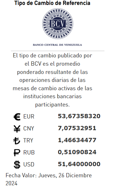 24-12-24.-El precio del dólar en el Banco Central de Venezuela (BCV) se cotizó este lunes 23 de diciembre 2024 en Bs.51,64 por unidad según la última actualización en su página web oficial y redes sociales.