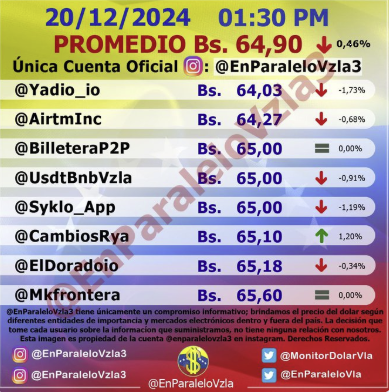 Por otro lado, el dólar paralelo en diversas plataformas en la jornada de hoy cerró en un promedio de Bs.64,90 la unidad, según Monitor-Noticias Venezuela.