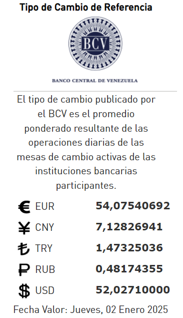 31-12-24.-El precio del dólar en el Banco Central de Venezuela (BCV) se cotizó este lunes 30 de diciembre 2024 en Bs.52,02 por unidad según la última actualización en su página web oficial y redes sociales.