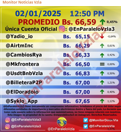 Por otro lado, el dólar paralelo en diversas plataformas en la jornada de hoy cerró en un promedio de Bs.66,59 la unidad, según Monitor-Noticias Venezuela.