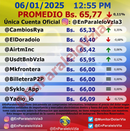 Por otro lado, el dólar paralelo en diversas plataformas en la jornada de hoy cerró en un promedio de Bs.65,77 la unidad, según Monitor-Noticias Venezuela.