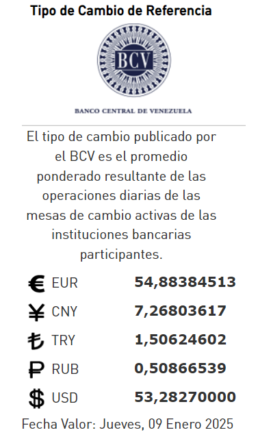 09-01-25.-El precio del dólar en el Banco Central de Venezuela (BCV) se cotizó este miércoles 08 de enero 2025 en Bs.53,28 por unidad según la última actualización en su página web oficial y redes sociales.