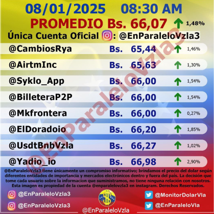 Por otro lado, el dólar paralelo en diversas plataformas en la jornada de hoy cerró en un promedio de Bs.66,07 la unidad, según Monitor-Noticias Venezuela.