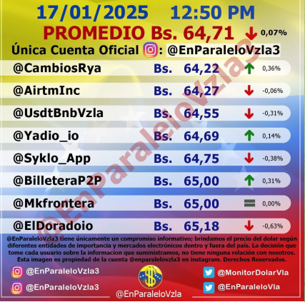 Por otro lado, el dólar paralelo en diversas plataformas en la jornada de hoy cerró en un promedio de Bs.64,71 la unidad, según Monitor-Noticias Venezuela.