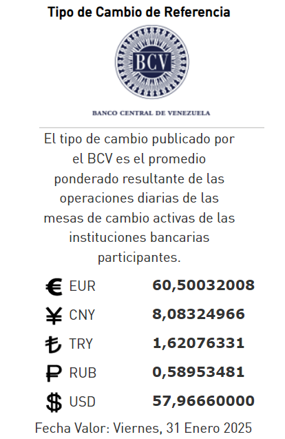 31-01-25.-El precio del dólar en el Banco Central de Venezuela (BCV) se cotizó este de enero 2025 en Bs.57,96 por unidad según la última actualización en su página web oficial y redes sociales.