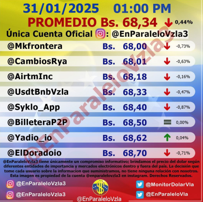 Por otro lado, el dólar paralelo en diversas plataformas en la jornada de hoy cerró en un promedio de Bs.68,34 la unidad, según Monitor-Noticias Venezuela.