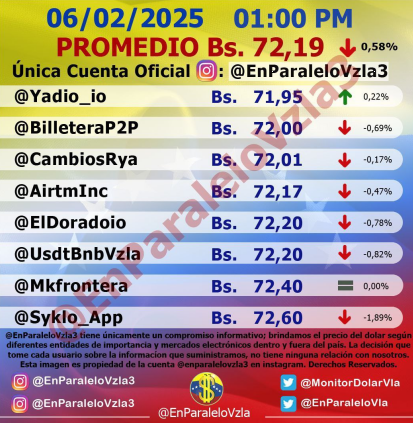 Por otro lado, el dólar paralelo en diversas plataformas en la jornada de hoy cerró en un promedio de Bs.72,19 la unidad, según Monitor-Noticias Venezuela.