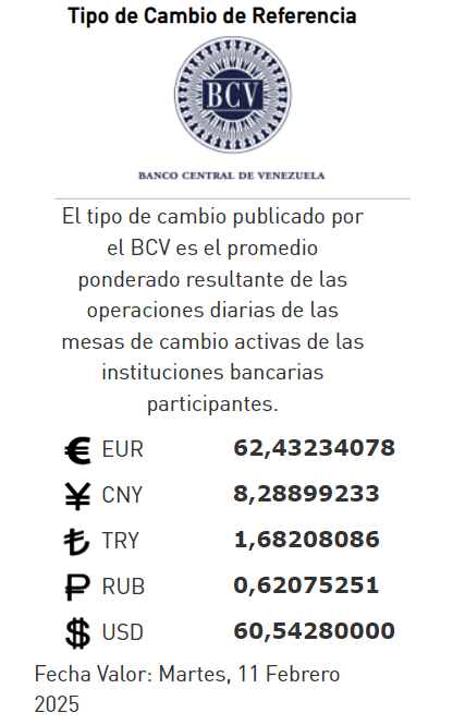11-02-25.-El precio del dólar en el Banco Central de Venezuela (BCV) se cotizó este lunes 10 de febrero 2025 en Bs.60,54 por unidad según la última actualización en su página web oficial y redes sociales.