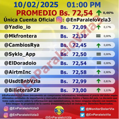 Por otro lado, el dólar paralelo en diversas plataformas en la jornada de hoy cerró en un promedio de Bs.72,54 la unidad, según Monitor-Noticias Venezuela.