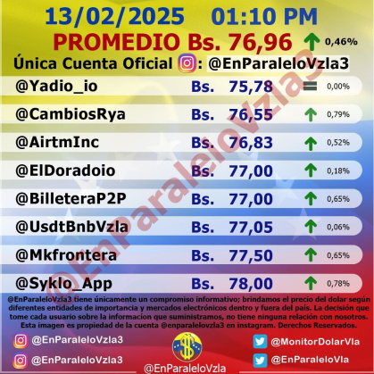 Por otro lado, el dólar paralelo en diversas plataformas en la jornada de hoy cerró en un promedio de Bs.76,96 la unidad, según Monitor-Noticias Venezuela.